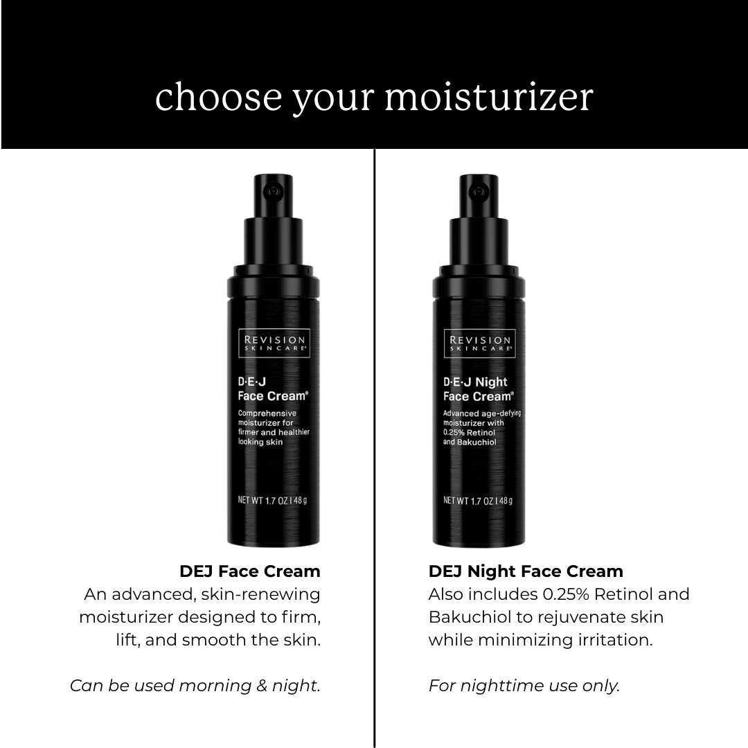 Your choice of DEJ moisturizer: DEJ Face Cream or DEJ Night Face Cream (contains retinol 0.25)